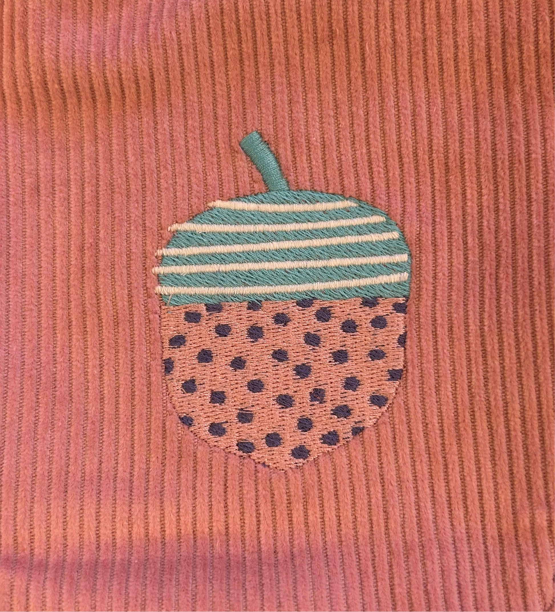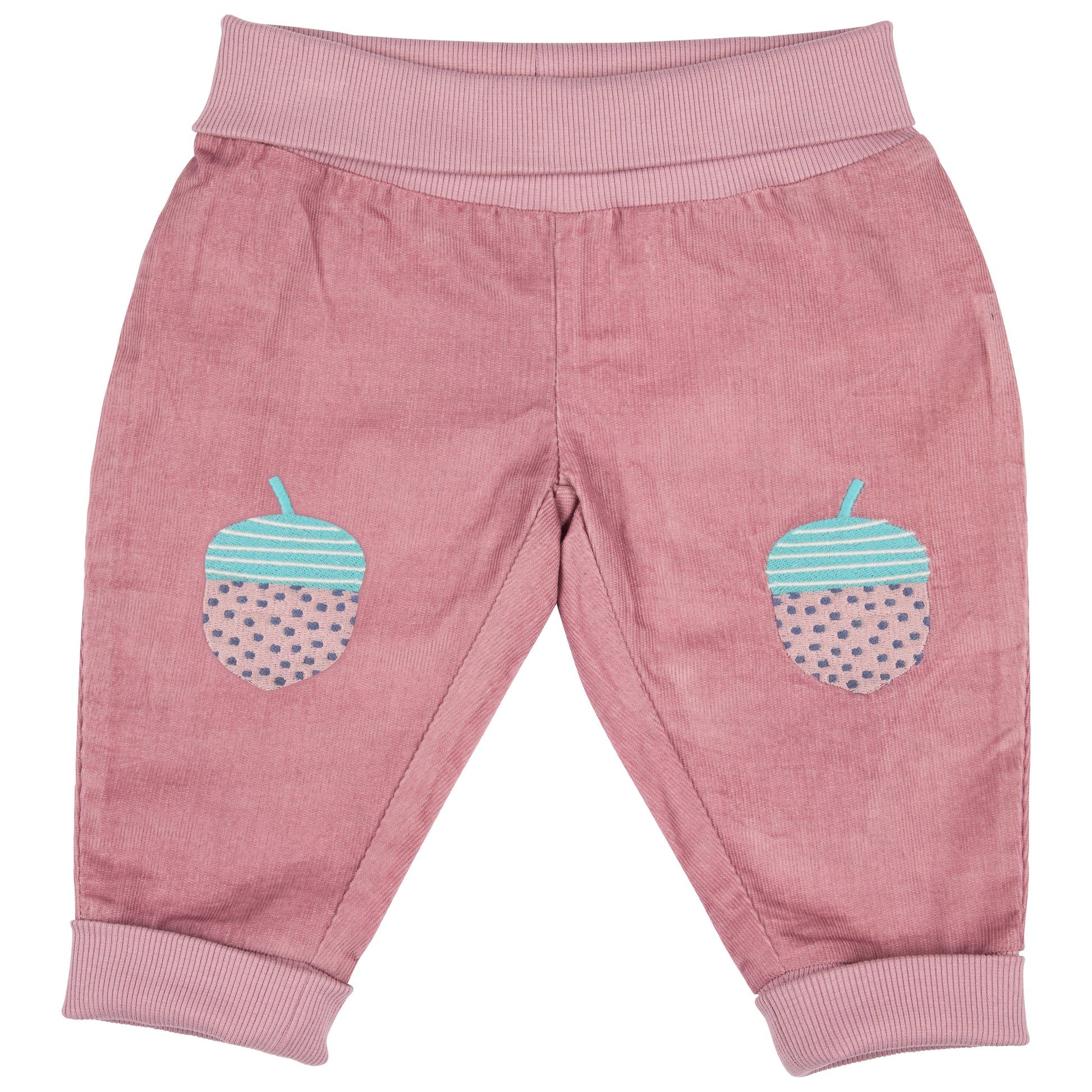 Comfy chunky cord trousers with soft rib at waistband and at ankles to keep the draft out. Acorn embroidery on knees.