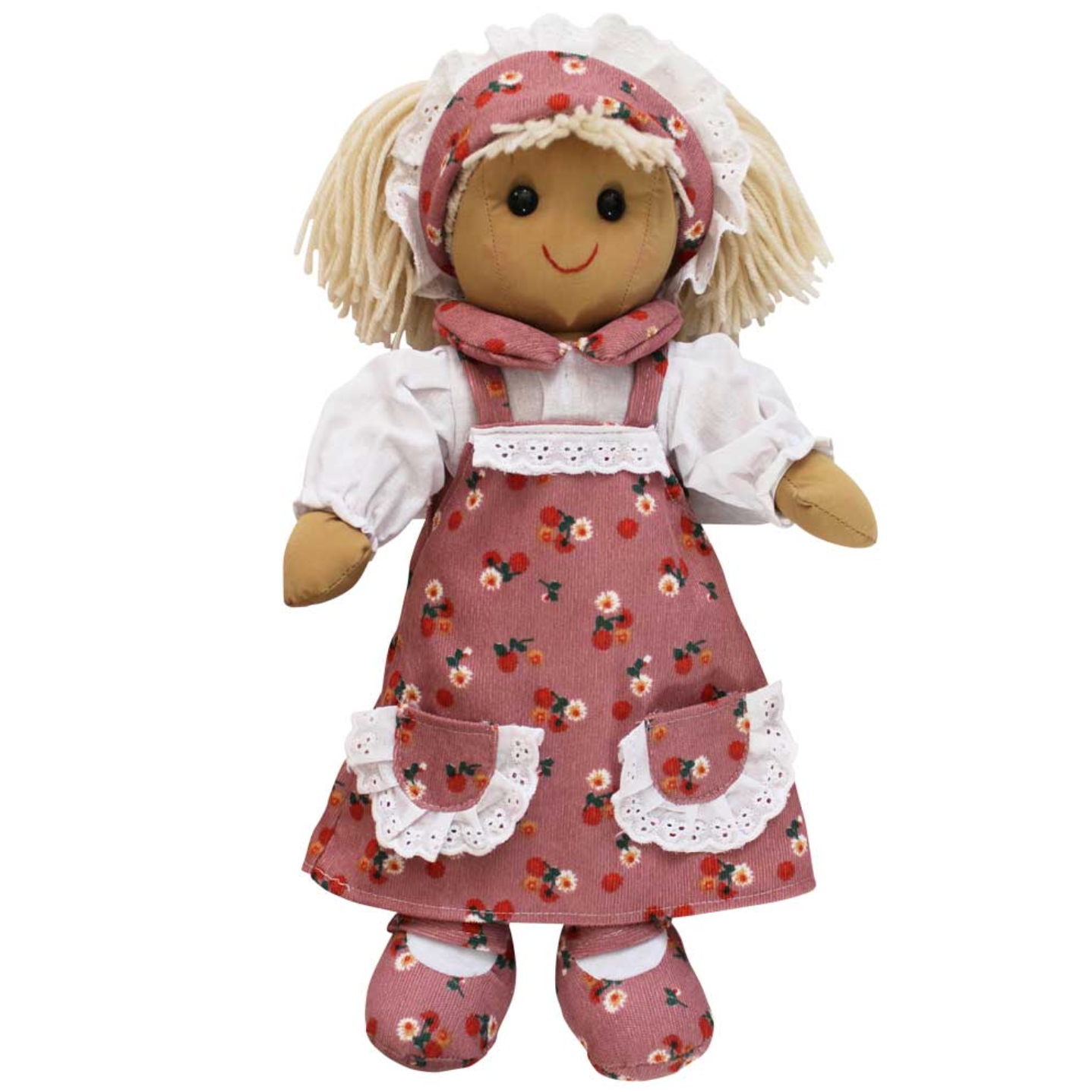 Pretty blonde haired dolly with bunches and headband. She wears a blush pink floral cord pinafore dress with white lace trimmed pockets, a white long sleeved shirt which is trimmed with a blush pink floral print cord collar and matching little pink cord floral shoes. Our rag dolls are designed to be loved by all ages.