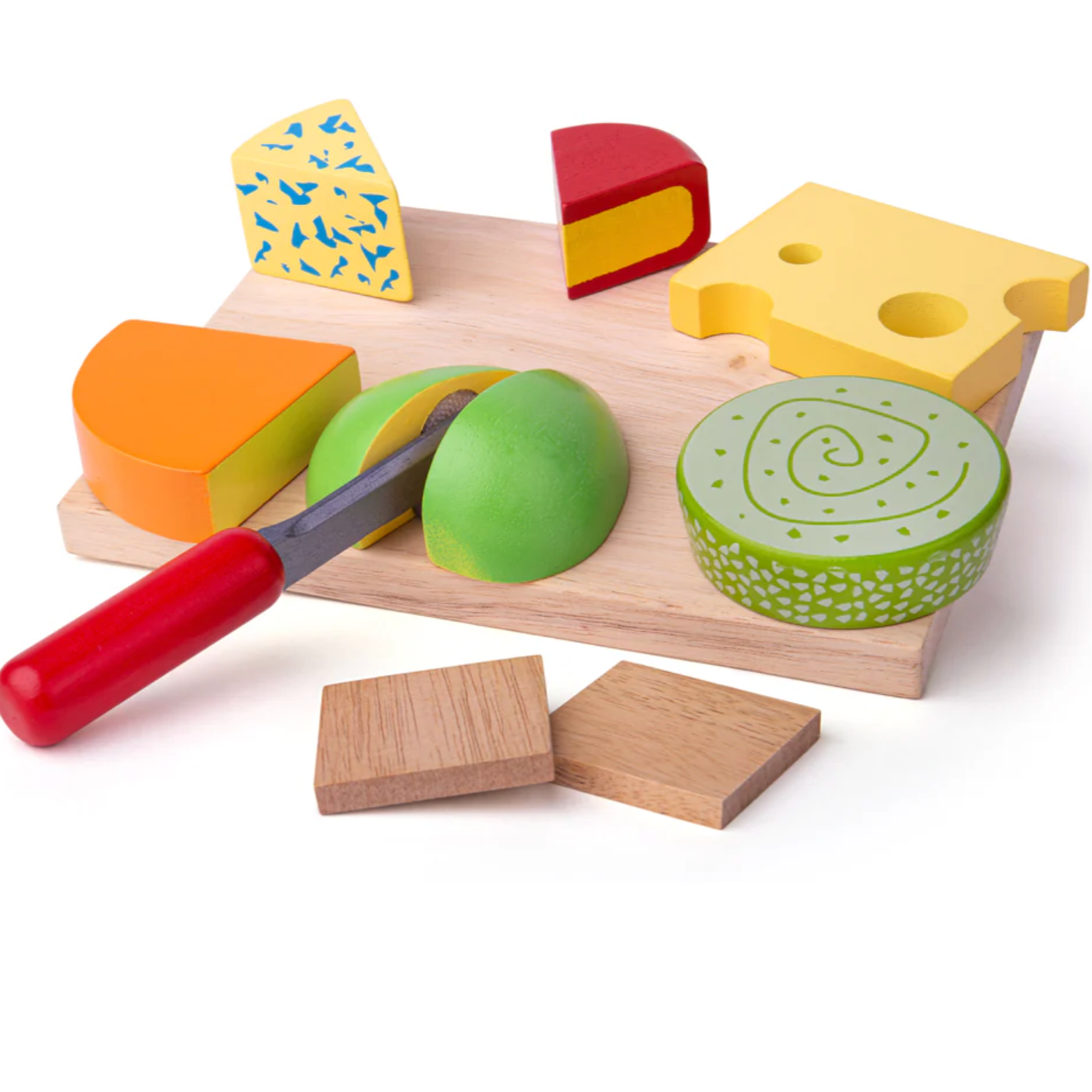 - Wooden play food with 5 cheeses (stilton, cheddar, roule, edam, emmental)