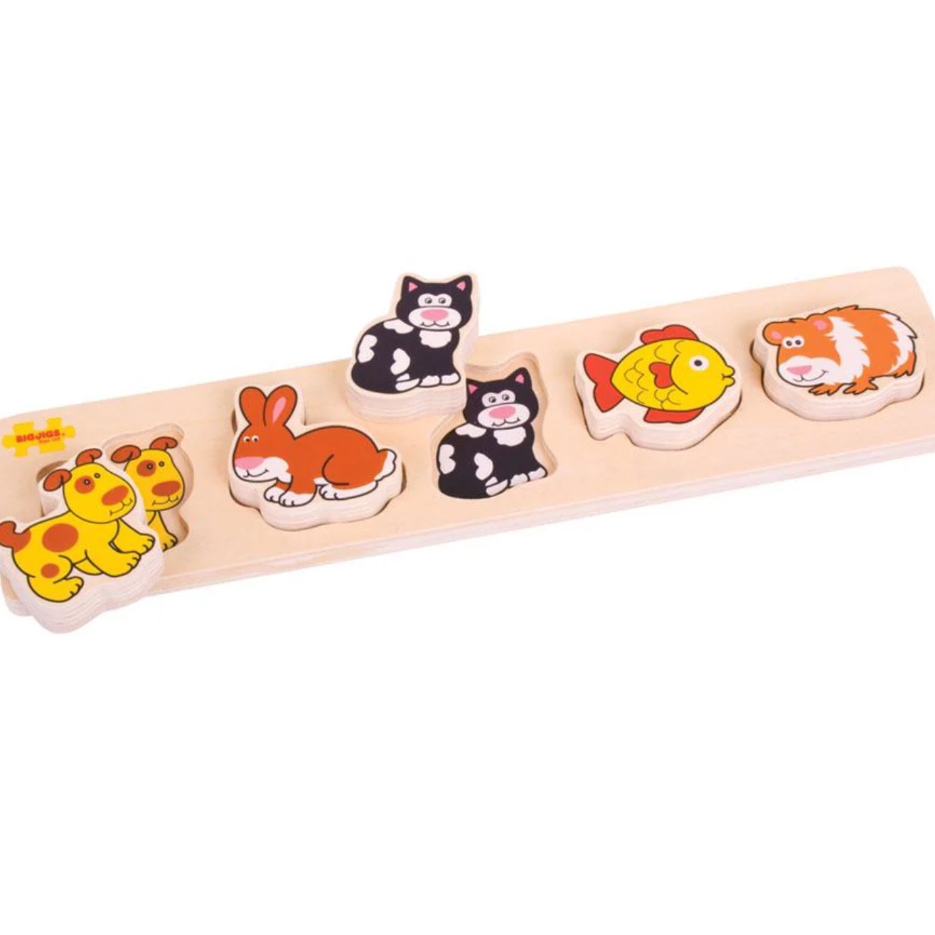 Match each brightly coloured wooden piece to the correctly shaped slot on the base board. Bigjigs Toys wooden puzzles help to develop vocabulary and aid youngsters to recall words as they recognise shapes, colours and images. Each chunky wooden puzzle piece is generously sized to make it easier for little hands to lift, grasp, examine and replace. Helps to develop dexterity, matching skills and concentration. The wooden base boards of Bigjigs Toys puzzles are printed with images or colours to aid the learning process and add educational value. Compact dimensions ensure that this puzzle is a useful playmate both at home and when travelling. Made from high quality, sustainably sourced FSC® Certified wood. Conforms to current European safety standards. 5 puzzle pieces.