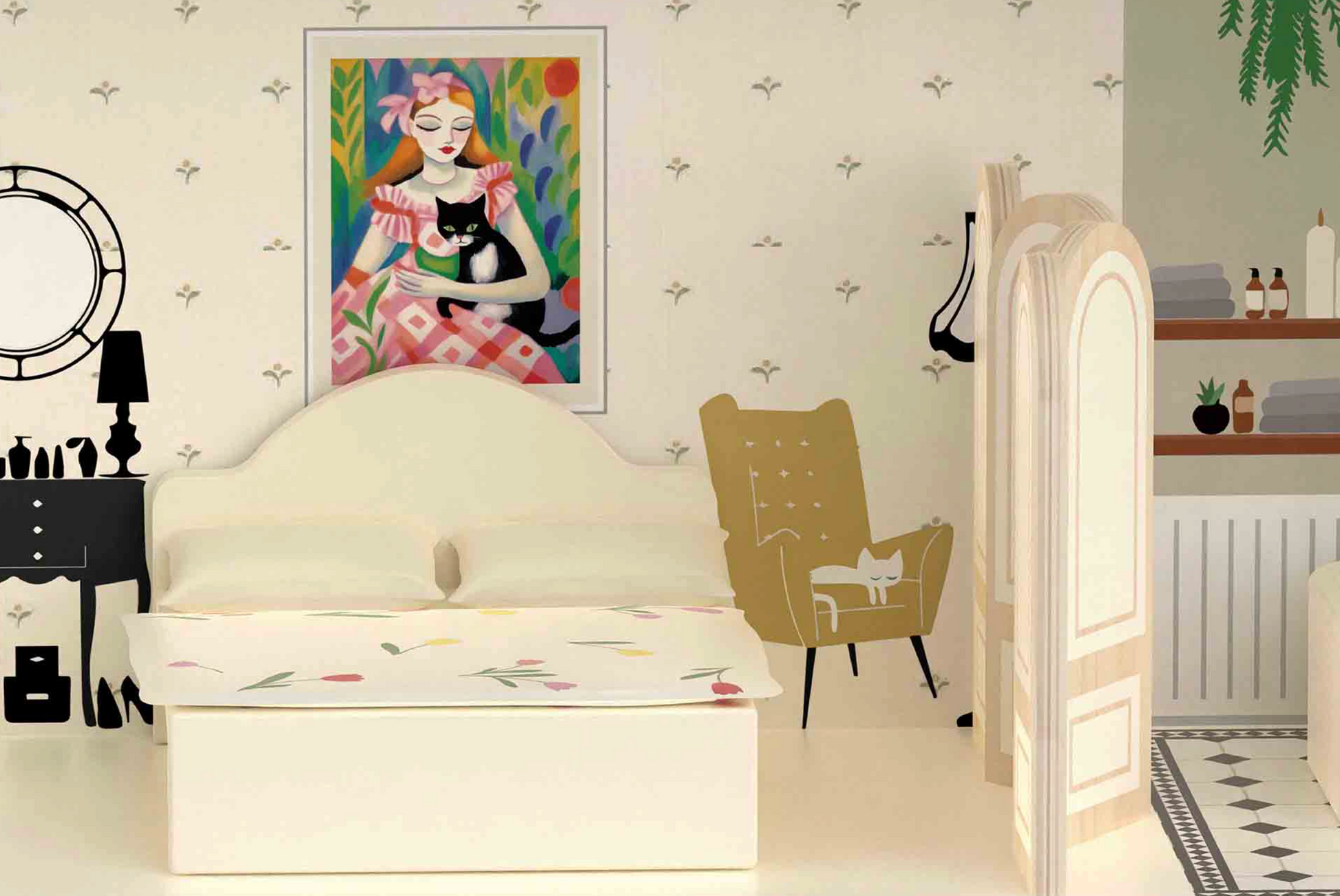 Furniture includes: a bed with covers, bath, sofa, lamp, table and 2 chairs, kitchen appliances, to name a few. It also comes with a doll and their pet dog and cat.