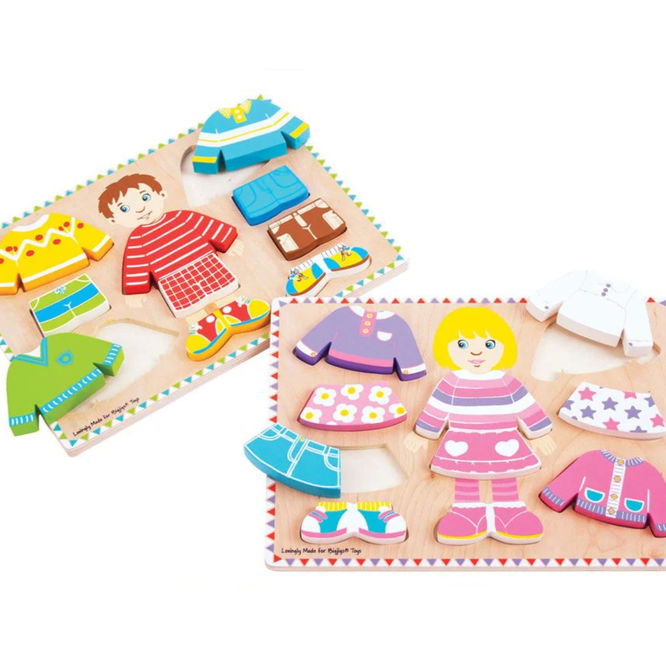 Match the brightly coloured wooden pieces to the correctly shaped slot on the base board and learn all about clothes and getting dressed! Mix and match the pieces to find colour co-ordinated outfits. Bigjigs Toys wooden puzzles help to develop vocabulary and aid youngsters to recall words as they recognise shapes, colours and images. Each chunky wooden puzzle piece is generously sized to make it easier for little hands to lift, grasp, examine and replace. Helps to develop dexterity, matching skills and concentration. Made from high quality, responsibly sourced materials. Conforms to current European safety standards. 10 puzzle pieces.