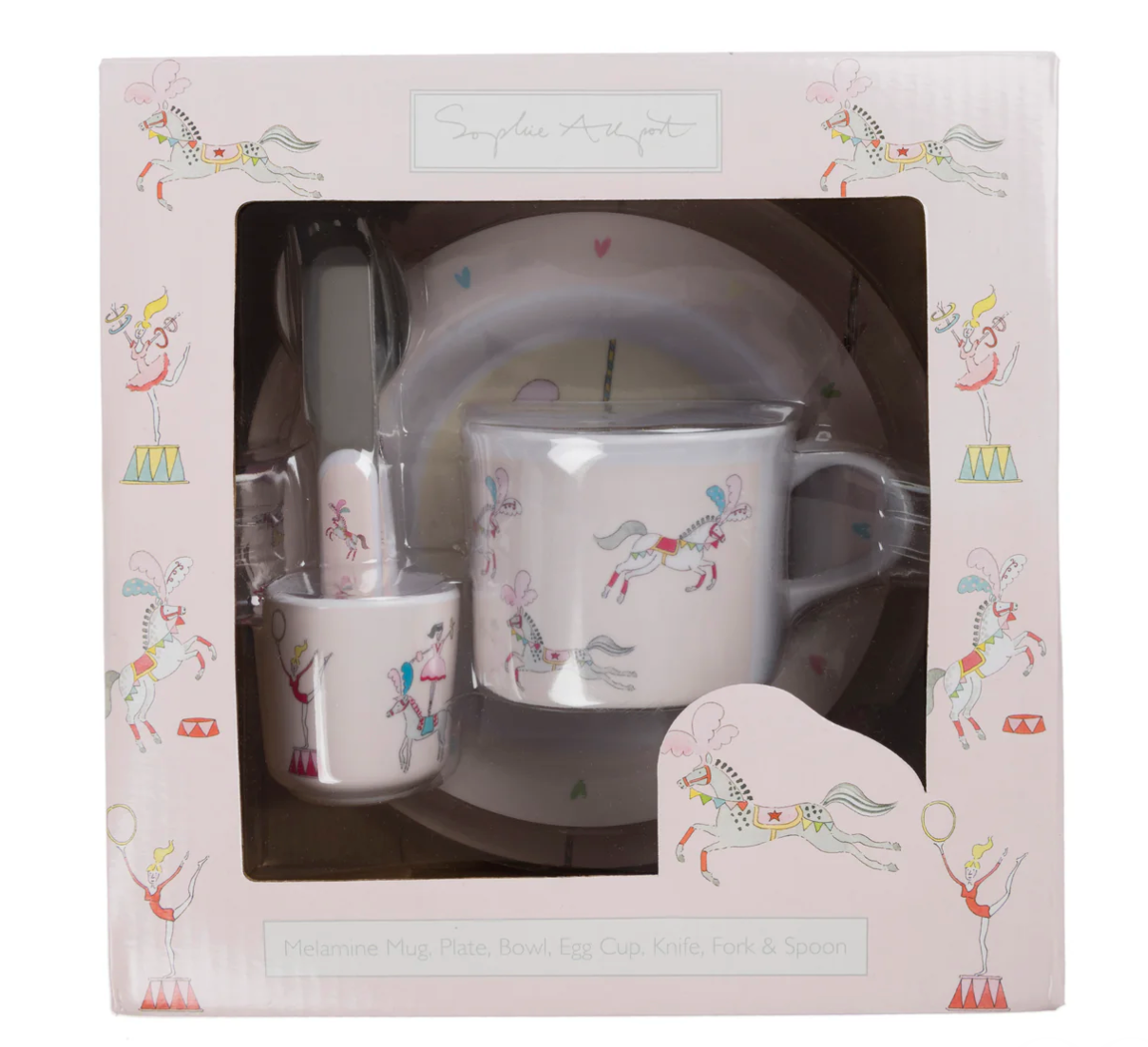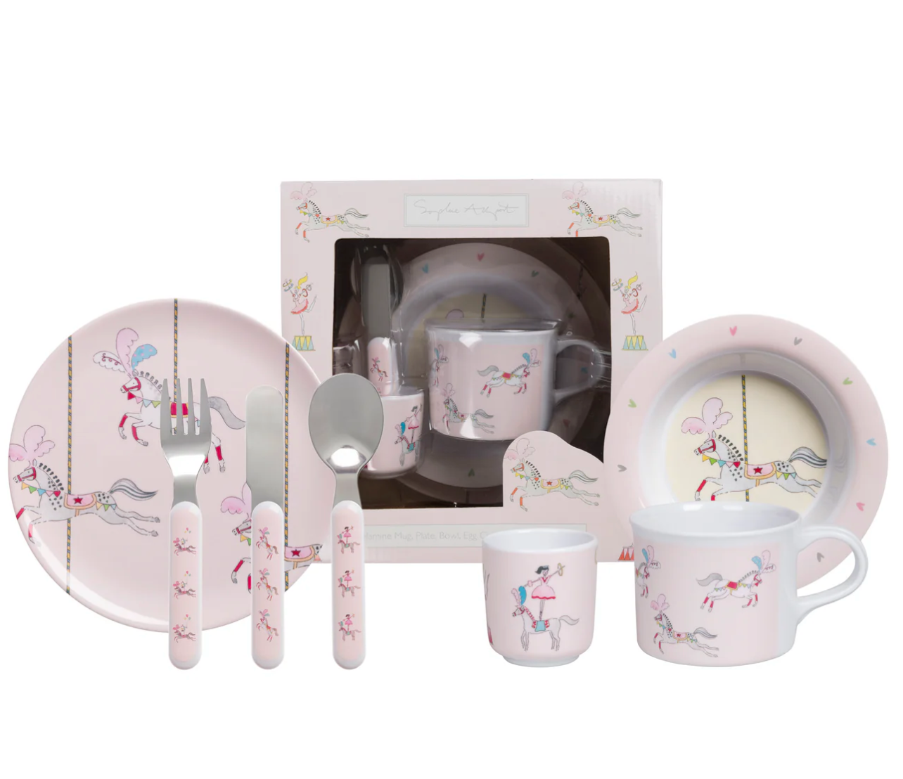 This Fairground Ponies themed seven-piece dining set includes a plate, bowl, cup, knife, fork, spoon and egg cup. A lovely little gift set for children's birthdays and christenings. This cute set features fairground ponies and acrobats on a sweet pink background.