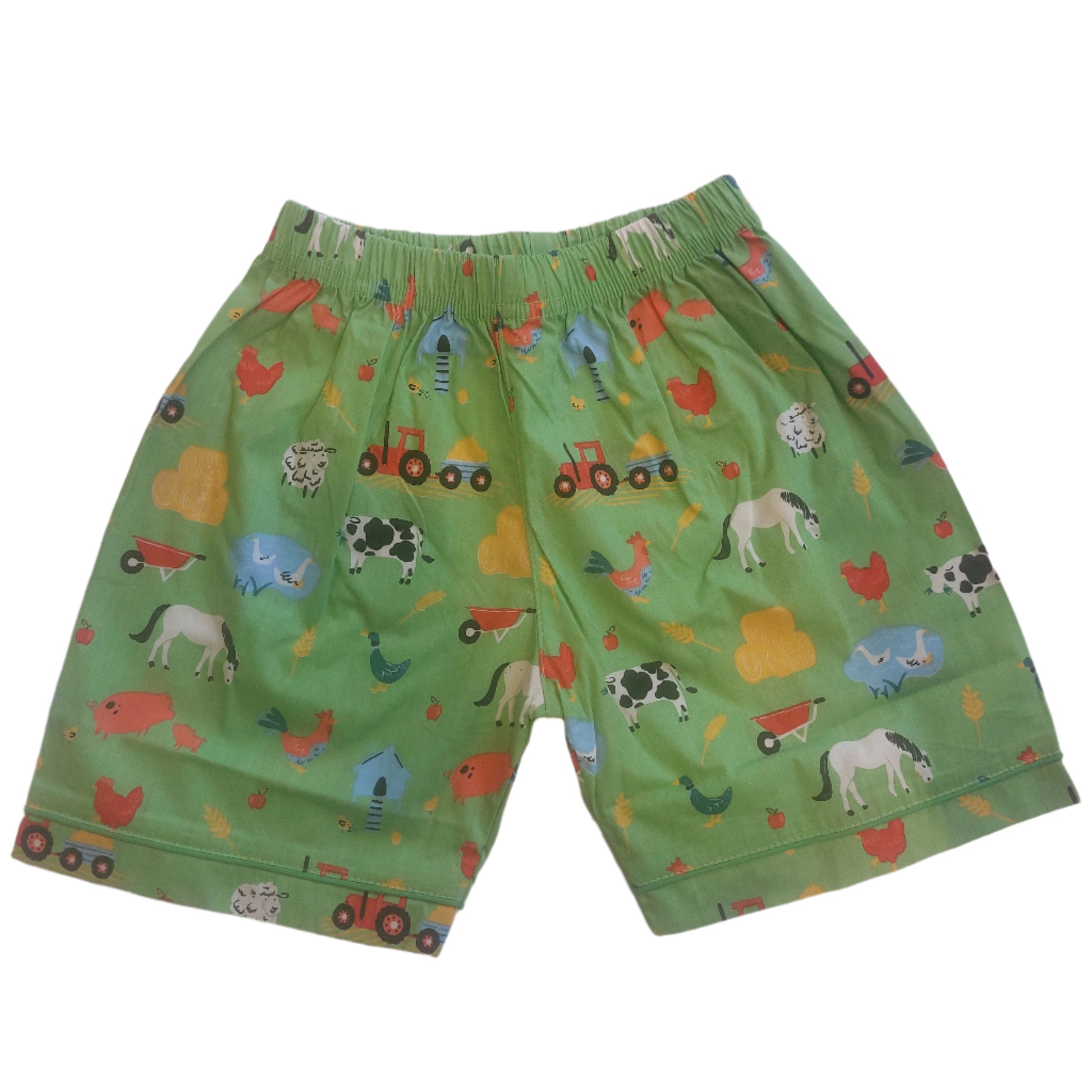 Cool cotton pyjamas which are ideal for summer nights. The charming print looks straight out of a storybook with its green background and busy farmyard scene with colourful animals, tractors, hay bales and hen houses.