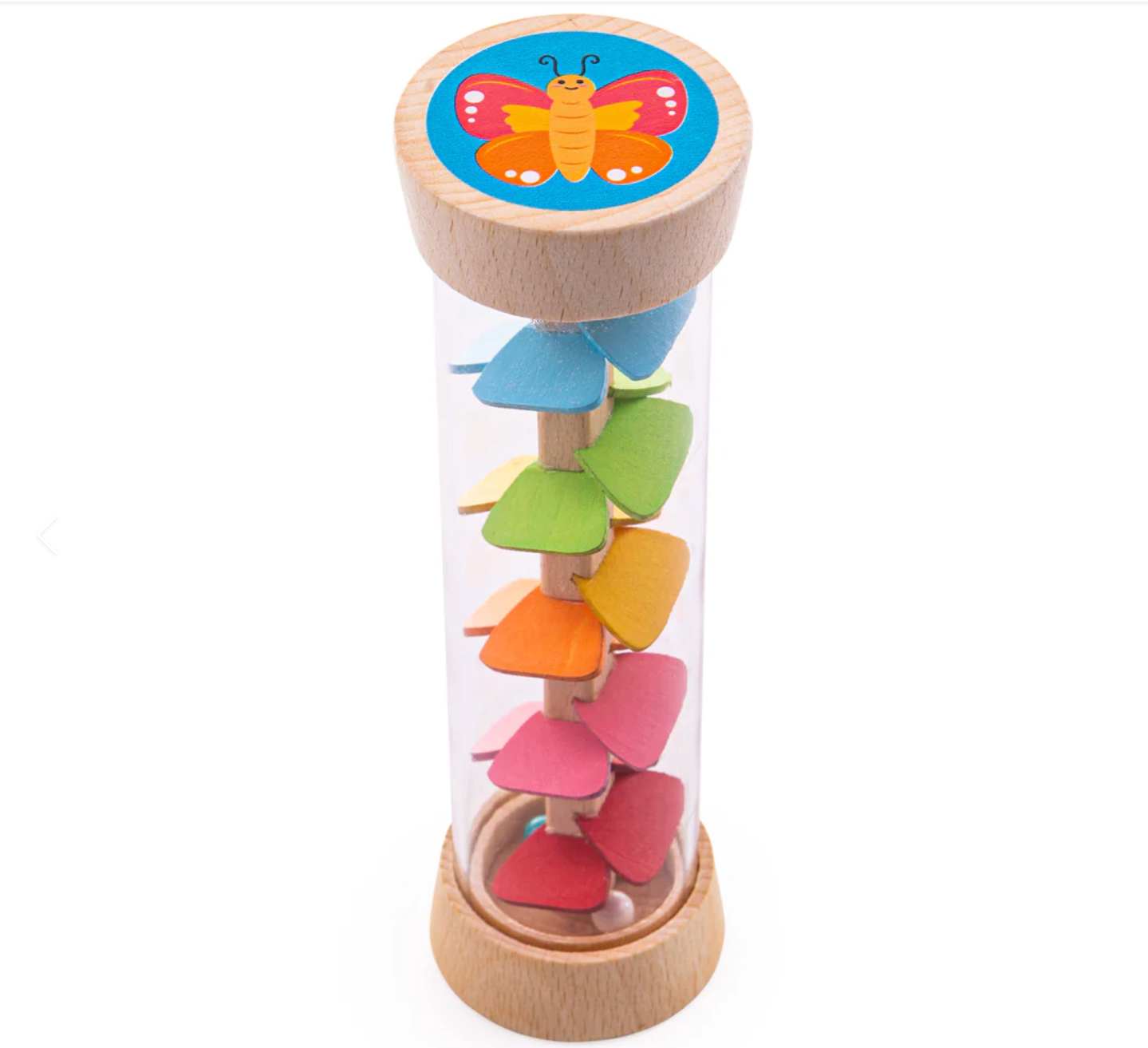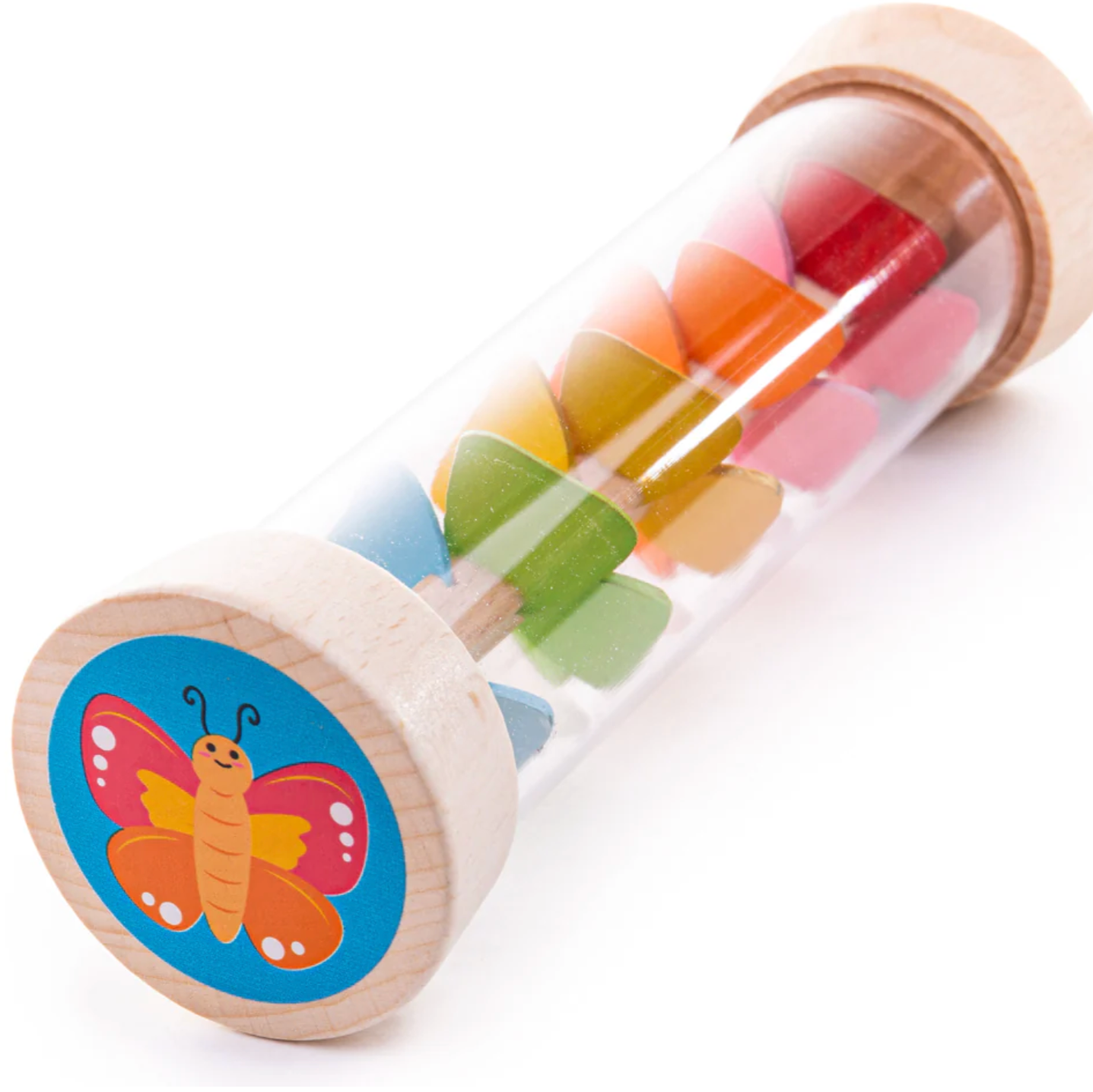 Our rainmaker sensory toy has been specially designed for busy little hands and to encourage hand-eye coordination as they roll, shake and turn the rainmaker. The rainmaker comes complete with cute illustrations on either end, a butterfly and a ladybug for more visual stimulation.