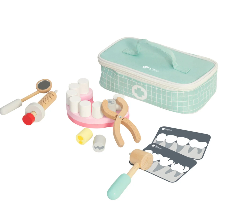 - Fun wooden dentist set with tools and wooden teeth the practice on.