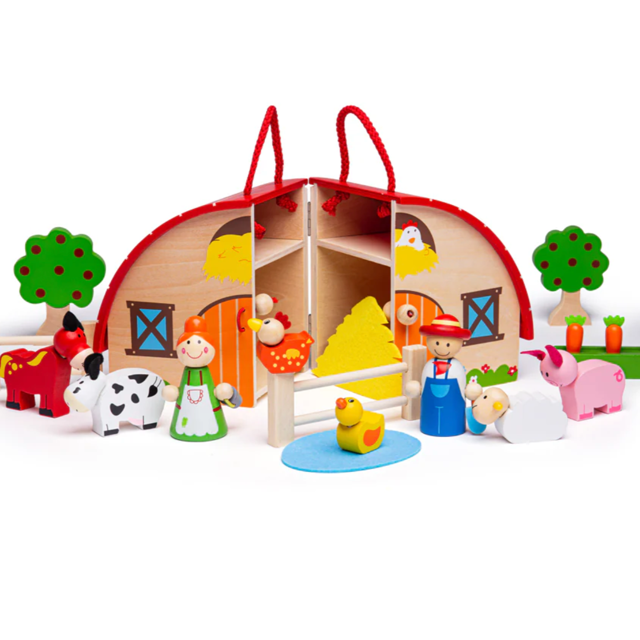 "Old MacDonald had a farm, E-I-E-I-O!" Our Mini Farm Toys Playset is packed full of colourful wooden animals and farm figures. Open up the playset to reveal Mr and Mrs Farmer, a duck in a pond, a horse, a sheep, a cow, a chicken, a pig, carrots, fences and trees.