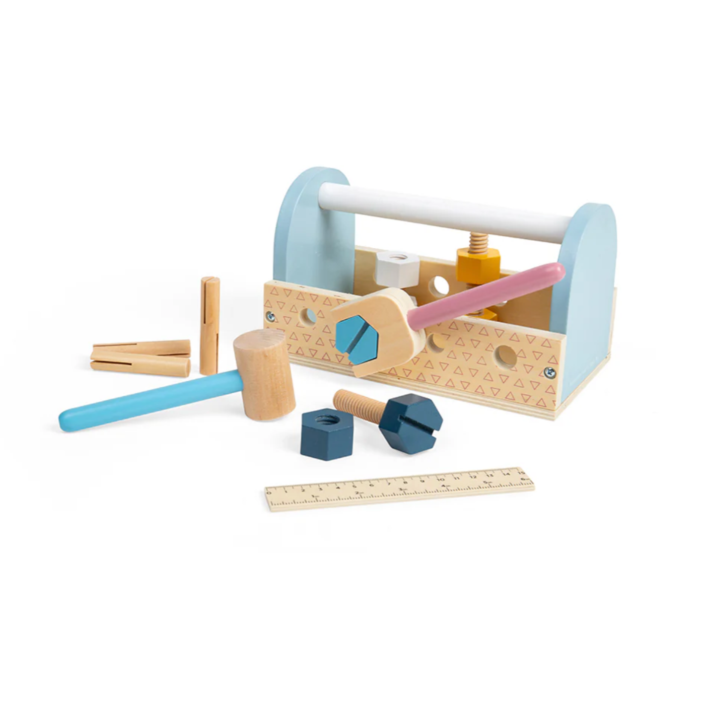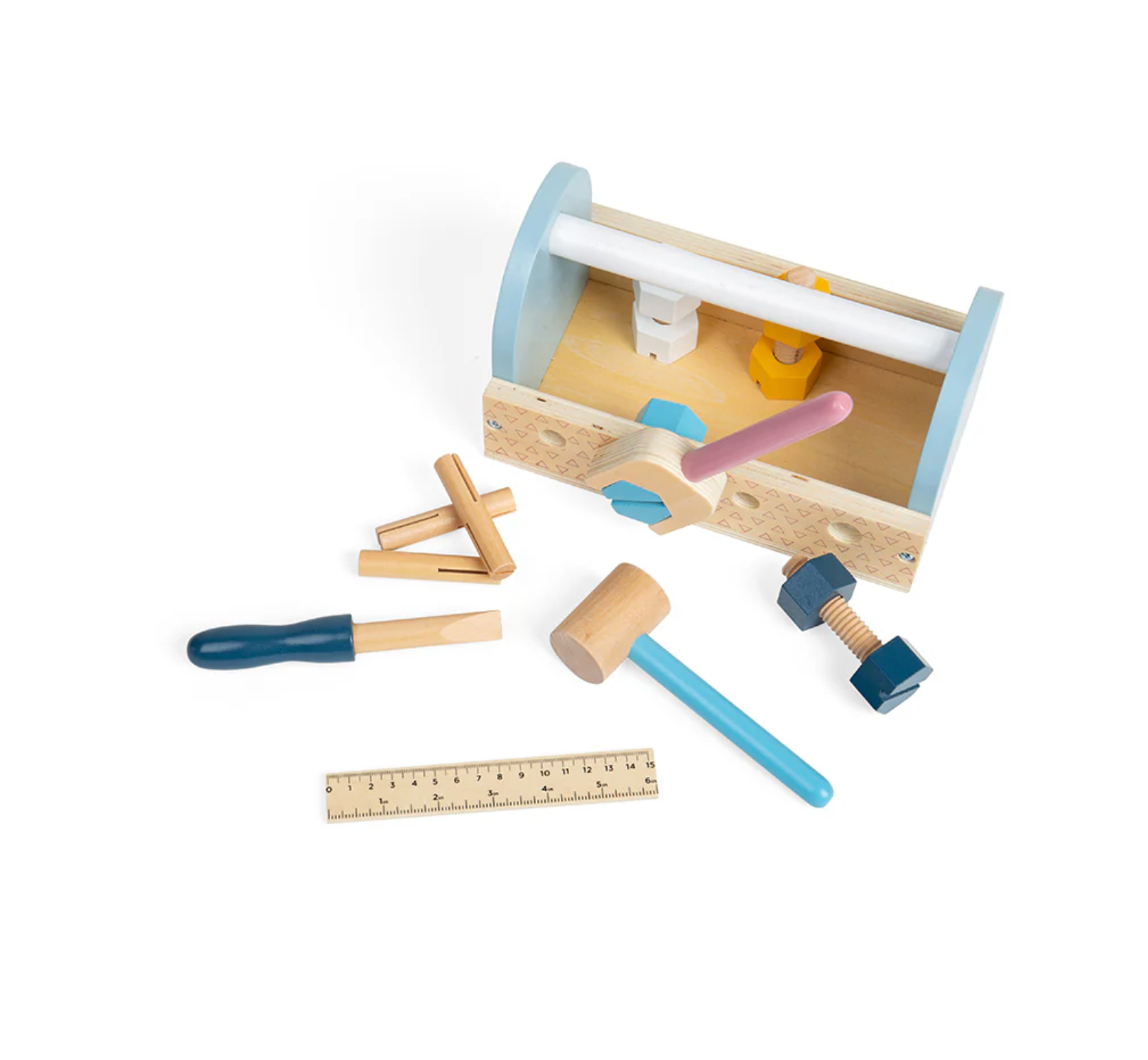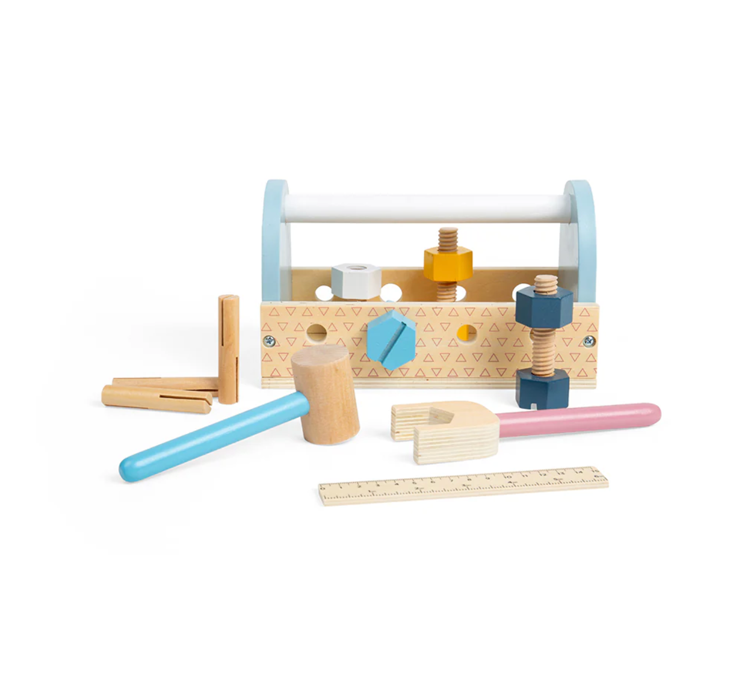 A builder needs their tools! Our FSC® Certified Kids Wooden Tool Box has all the tools little DIY enthusiasts need for their next project. Comes with a spanner, hammer, screwdriver, ruler and nuts & bolts.
