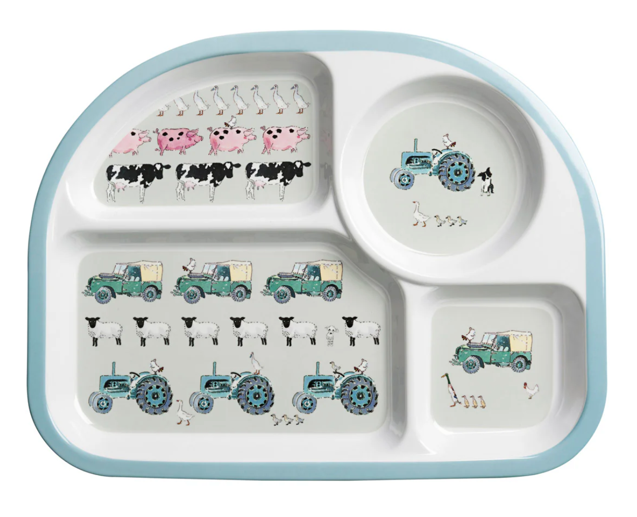 A practical melamine divider plate to make children's mealtimes fun! There are four separate sections featuring pigs, cows, tractors, and land rovers. A great gift for little ones.