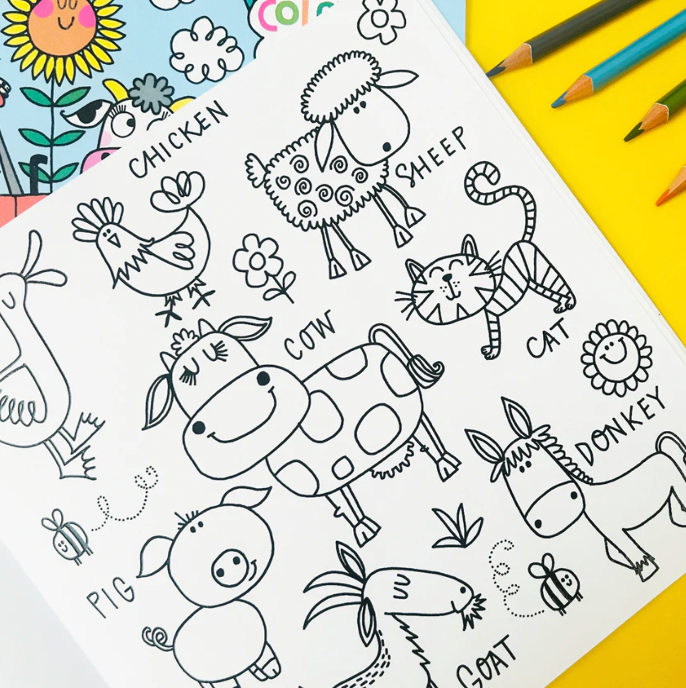 This kid's colouring book contains 12 pages of cute characters with the reverse side of each page left blank for your own creativity. Cute farm animal themed designs.