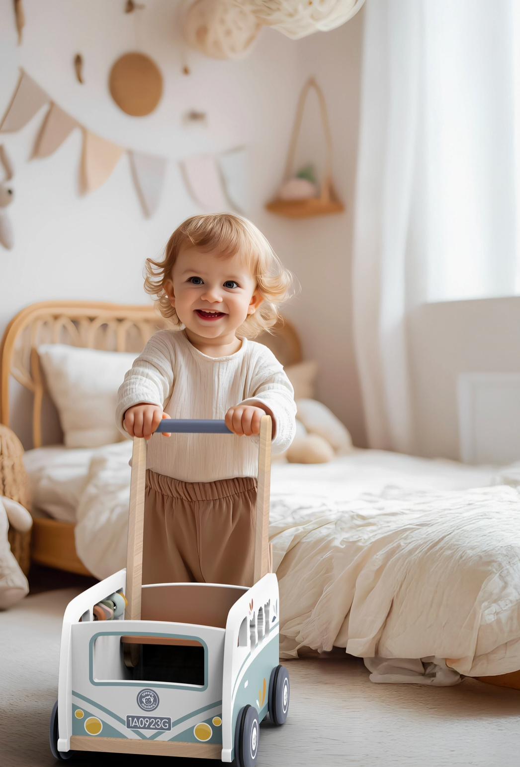 Introducing Van Multi-activity Walker! The Van Multi-Activity Walker is more than a toy, it's a trusty companion on your toddler's journey of movement, discovery, and joy! Get ready to roll, play, and learn. This is a dynamic toy designed to support your toddler's first steps while engaging them in early learning fun! Perfect for children 12 months and up, this wooden walker is packed with playful features, including three colourful blocks for shape sorting, and multiple activity panels to spark sensory exploration, motor skill development, and problem-solving. Whether your child is learning to walk or exploring cause-and-effect play, the Van Walker encourages independence and confidence every step of the way. For their security, the rubber wheels are quiet and non-slip. Also has a brake system to block wheels when toddler stand up but it is not confident enough to walk on his own. Made from FSC-certified wood and finished in non-toxic multicolor paint.