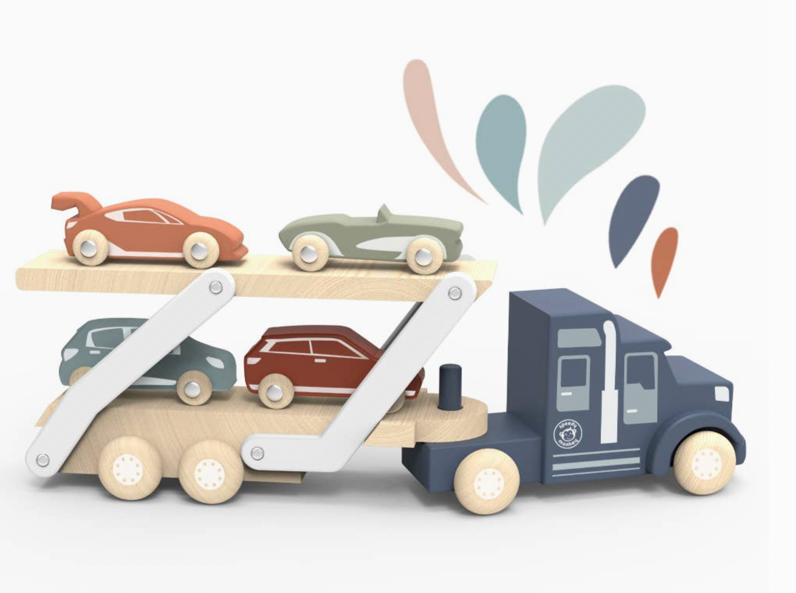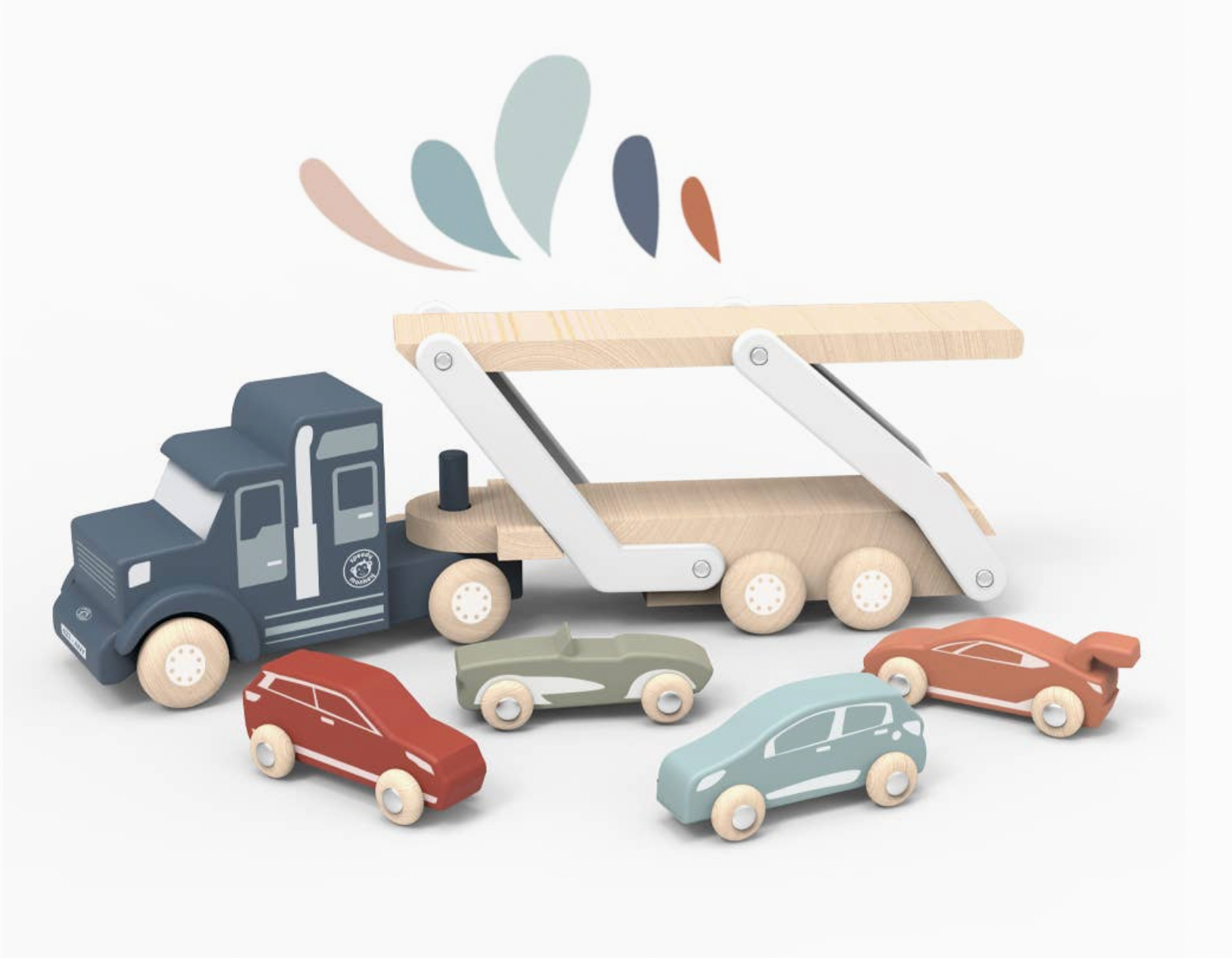 This wooden car transporter truck toy has a double-deck trailer. It easily converts for loading and unloading. Four colorful assorted models of solid wooden cars are included with the trailer. Slots are designed on the trailer to avoid cars from falling. Your little one can safely race along an imaginary road. While exciting and fun, this toy helps to develop fine motor skills, manual dexterity and creative play. This toy is crafted from sustainably sourced wood from FSC® certified forests and coated with non toxic paint.