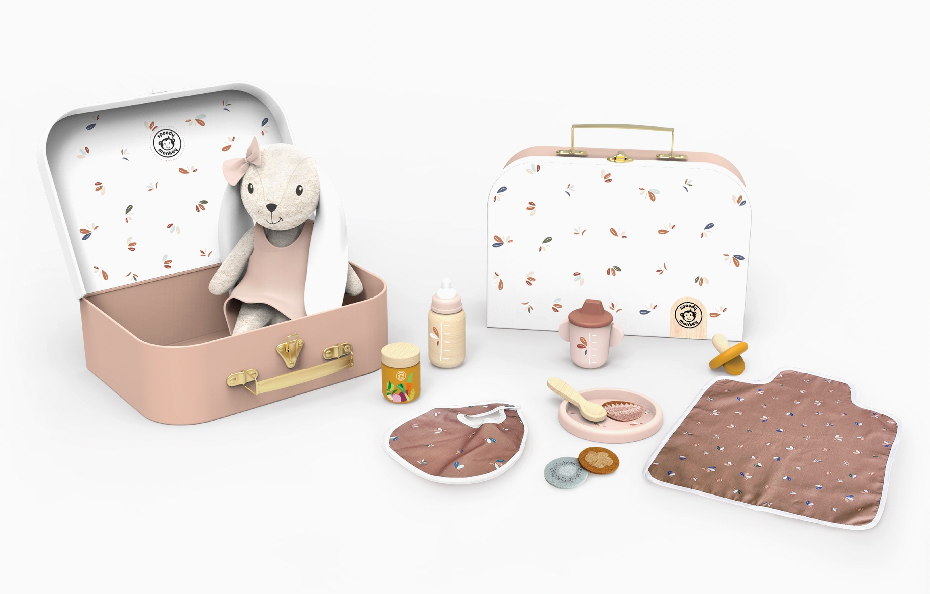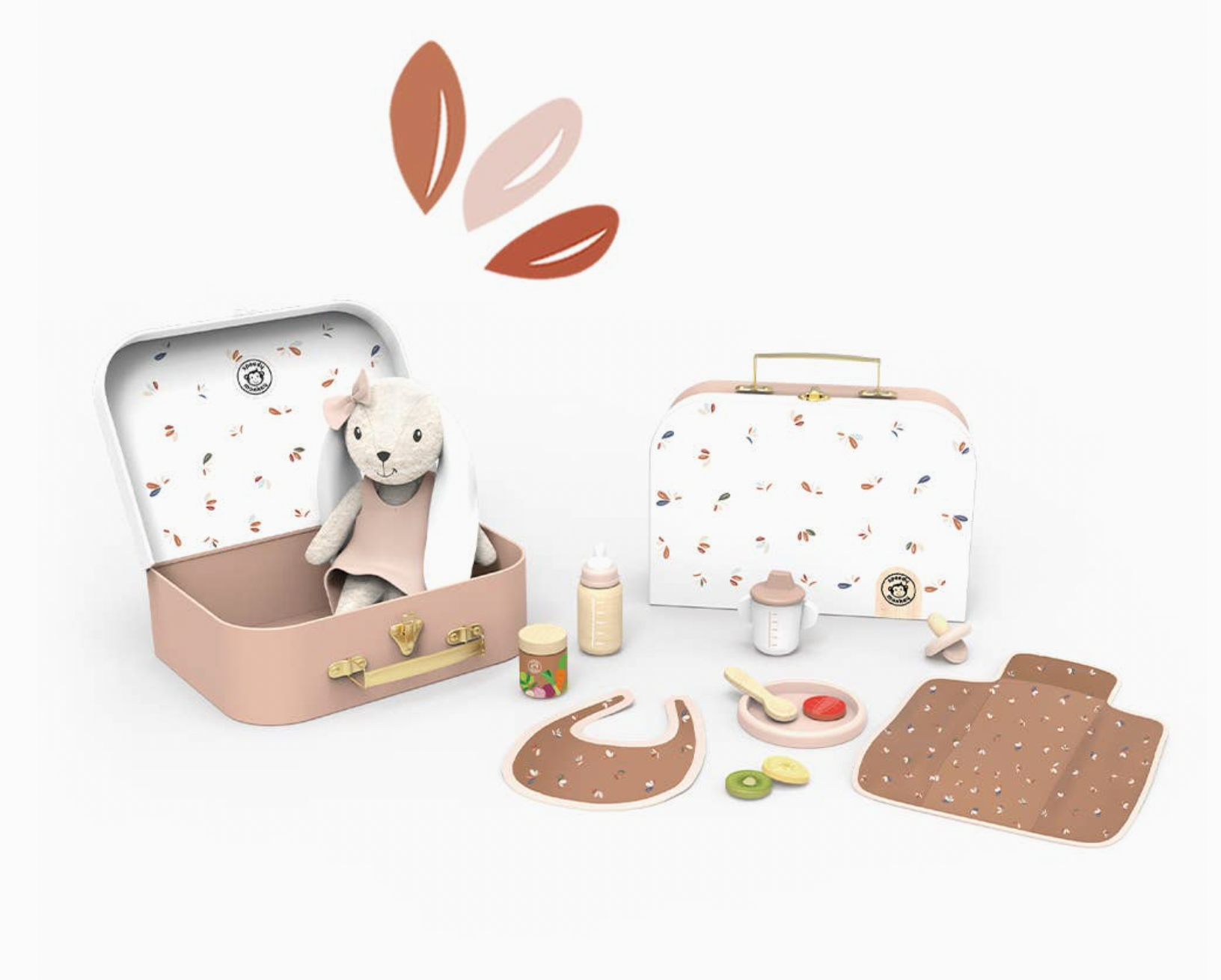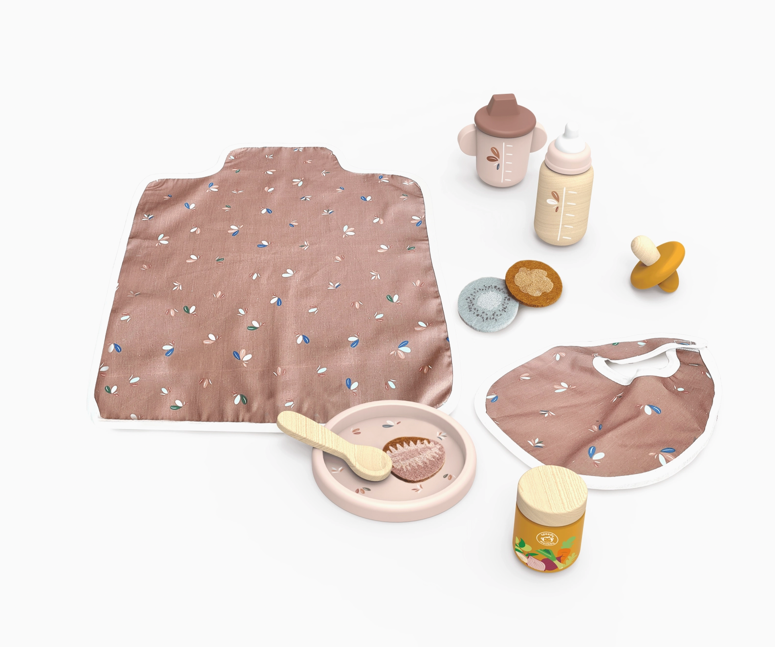Includes rabbit doll, baby meal accessories, bib and diaper changing pad.