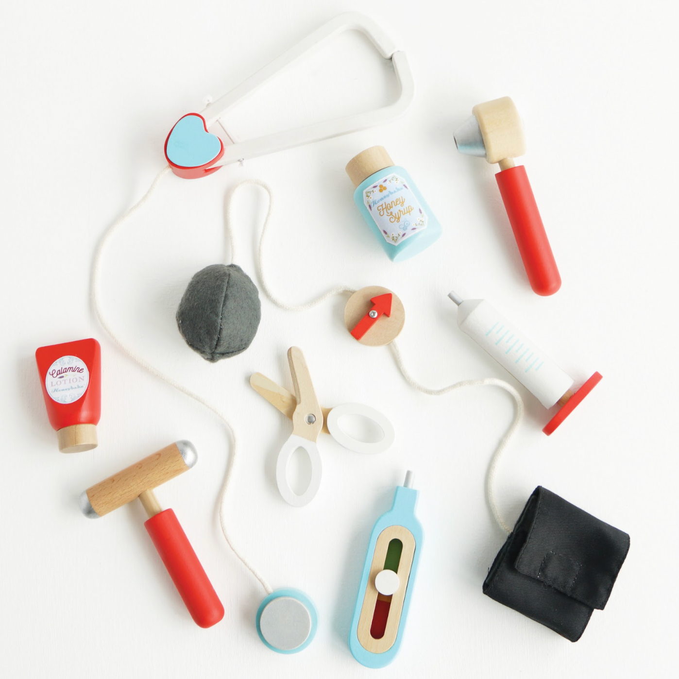 Comprising a vintage style fabric bag, crafted from a stunning red fabric with carry handles and a sturdy wooden base. Complete with 9 colourful wooden play accessories and unique features to discover, including a stethoscope, thermometer, ointment and more. Role play has never been so much fun!